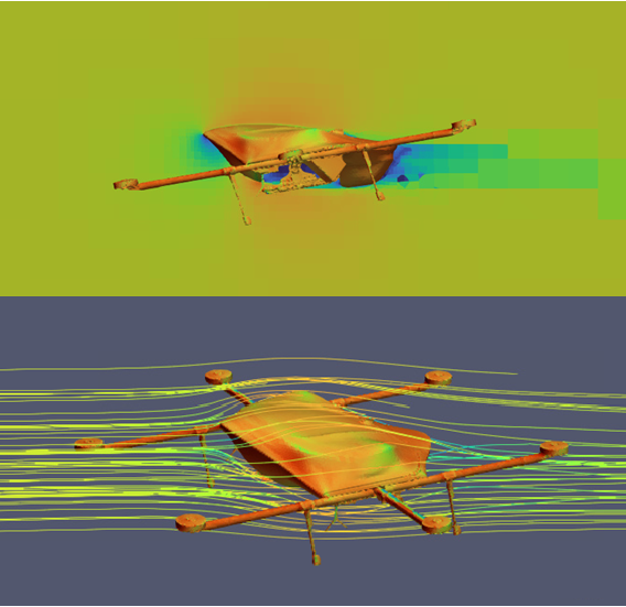 一方、物流特化型マルチコプターの主な目的は効率的な運搬です。目的地まで前進飛行を続ける場面が大半を占めるため、ホバリングしている時間よりも、前進飛行している時間の方が長くなります。さらに、できるだけ長距離飛行することが求められるため、必然的に飛行速度は速くなります。飛行速度が速くなると、空力の影響が大きくなるため、前進飛行時の空力性能は非常に重要になります。