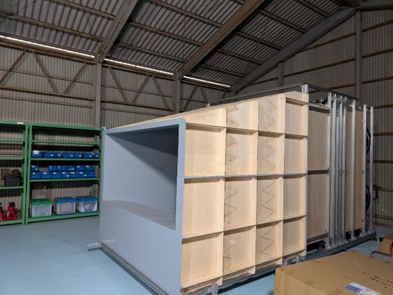 エアロネクストでは社内に小型風洞(出口寸法240mm x 240mm)と、低速大型風洞(出口寸法2,000mm x 1,000mm)があるため、容易に各種実験を行うことが可能となっています。