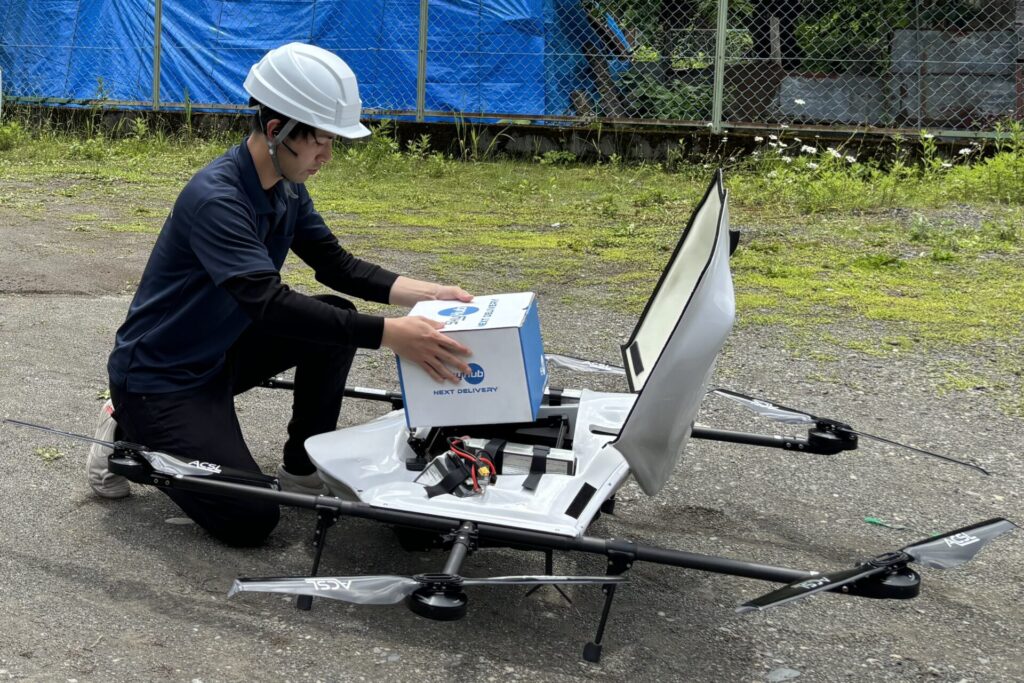 小菅村ドローンデポ®脇のドローン配送離陸地点で荷物を物流専用ドローンにセットするスタッフ