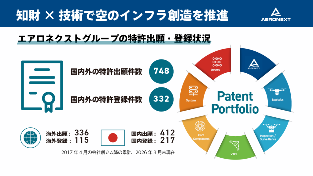 主にコアテクノロジーである、産業用ドローンの基本性能や物流専用ドローンの運搬性能を向上させる、独自の構造設計技術4D GRAVITY®*1やその周辺技術の特許、また、2021年から展開しているドローン配送を含む新スマート物流SkyHub®*2から生まれる事業活動に関しても、全てをライセンスモデルに転換を目指し、関連特許も多く出願しています。